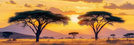 An African savanna landscape at sunset, with golden skies illuminating the tranquil, endless plains in a dramatic, banner