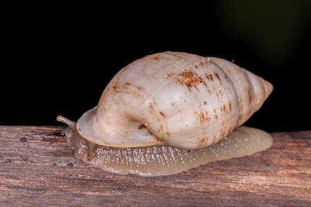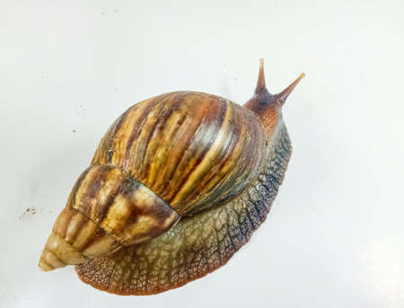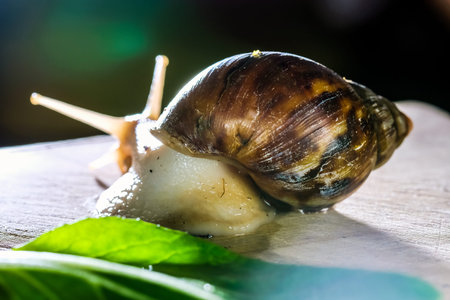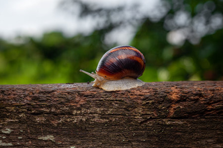Top view of Snail Achatina fulica, African giant snail, Archachatina marginata with natural background. The Snail is on the wood.Beautiful patterned brown snail crawl on the wood surface. African snail shrugs.