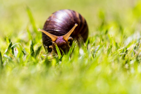 agate giant african land snail, Latin name Lissachatina fulica, on a stone against a green background