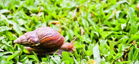 Big snail in shell crawling on road, summer day in garden, A garden snail is looking for food, edible snail or escargot, is a species of large and edible. ( Siput, Bekicot or Snail)