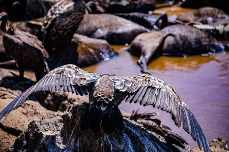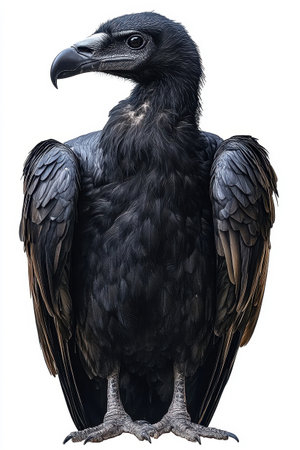 A striking black vulture displays its impressive wingspan while standing still. The bird's feathers glisten under bright sunlight, highlighting its striking physical features. This creature exudes a sense of strength and elegance.