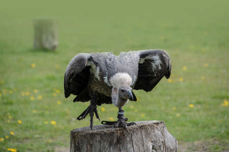 Portrait of a griffon vulture Gyps fulvus sitting on a tree stump