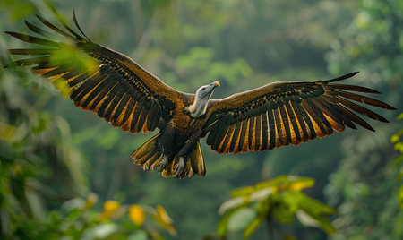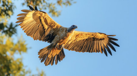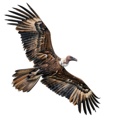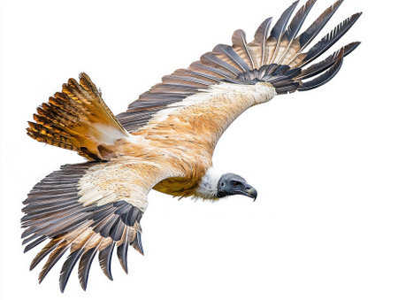 vulture glides through the air, its broad wings fully extended, capturing the essence of freedom and power in flight. The striking plumage contrasts beautifully with the white backdrop.