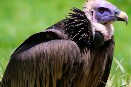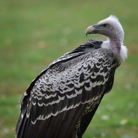 Griffon vulture in side angle view with green background