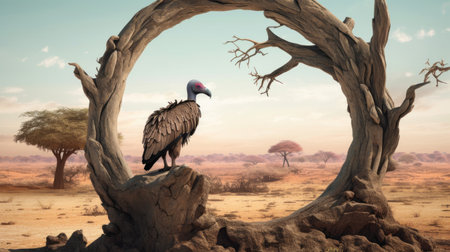 a large vulture perches on a decaying branch, illuminated by a golden light. this uhd image captures the vulture amidst multi-layered color fields, showcasing its majestic presence. the photo, reminiscent of national geographic's style, also features traditional costumes in light brown and red hues, adding a touch of manapunk aesthetic. ai generated