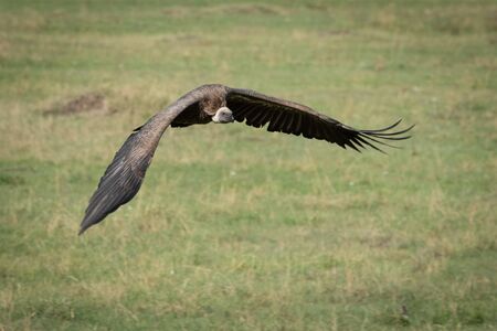 African white-backed vulture swoops low over grass