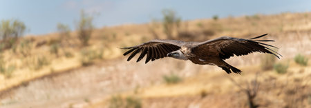 Profile view panorama of vulture gliding with blurred background