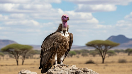 A majestic vulture stands on a rock, overlooking a vast and dramatic landscape. The serene scene captures the essence of wildlife in a stunning natural environment.