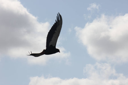 A low angle shot of a vulture flying in a sky