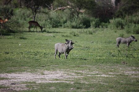 A view of warthogs in their habitat on safari in Okavanga, Delta, Botswana
