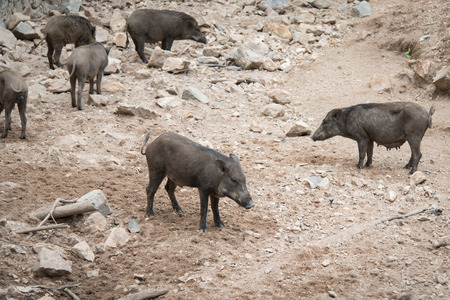 Warthog, Phacochoerus aethiopicus and his babies stand on a dirt road in Bandia reserve, Senegal. It is a wildlife photo in safari from Africa. They are animal portraits.