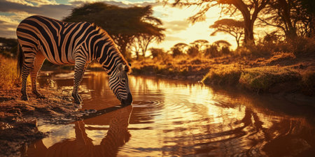 zebra at sunset drinking from a hole in the ground, in the style of impressive panoramas, sparkling water reflections.