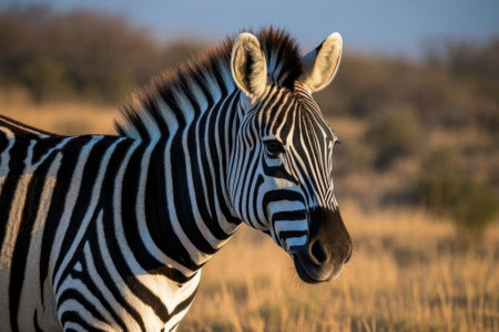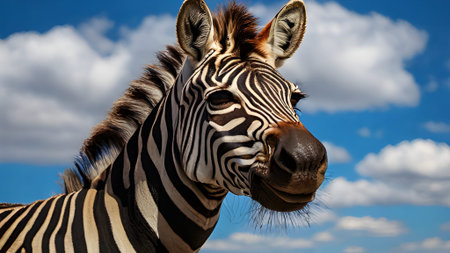 A stunning zebra portrait with a close up view against a beautiful sky. The wildlife animal is captured in its natural habitat.
