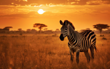 Experience the beauty of a zebra grazing gracefully in golden grass under the warm light of the setting sun in the African savannah, highlighting nature's elegance.
