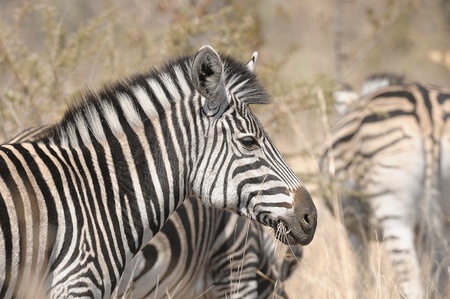 Wild african life. Close up Namibian mountain zebra in the middle of the savannah.