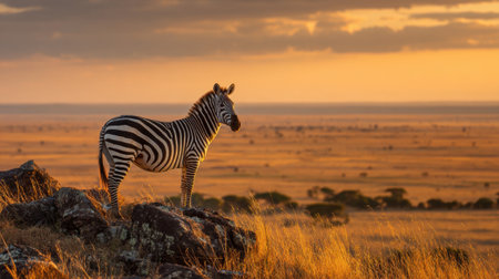 Zebra standing on rock at sunset in african savanna landscape.
