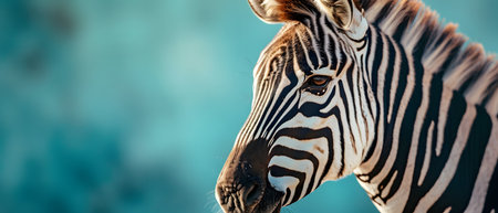 Closeup of zebra head on blue background. Panoramic image.