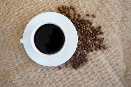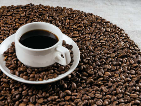 Coffee cup with roasted coffee beans on linen background. Mug of black coffe with scattered coffee beans. Fresh coffee beans.