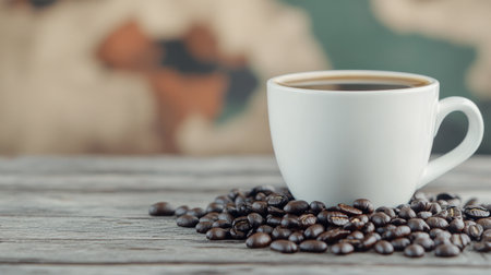 Cup of coffee with coffee beans in the background. World Coffee Day, americano and espresso background
