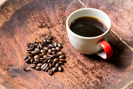 Coffee beans background on wooden, Fresh coffee beans with coffee cup on wooden background, Drinking set background.
