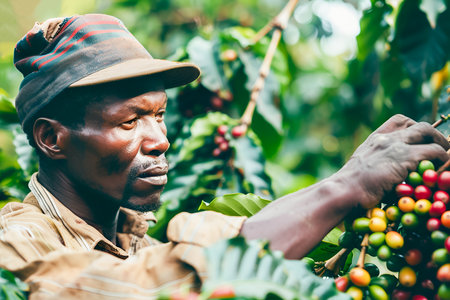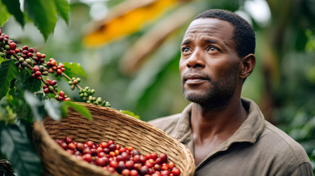 Farmer harvesting ripe coffee cherries in a lush plantation, focused on future growth