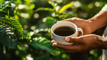 Enjoying freshly brewed coffee amidst lush coffee plants on a sunny day in a tropical plantation
