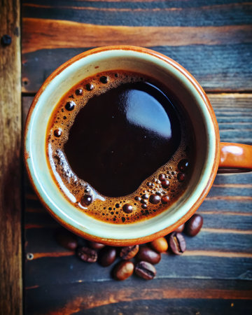a dynamic drop of coffee poured into a cup and coffee beans scattered in the background