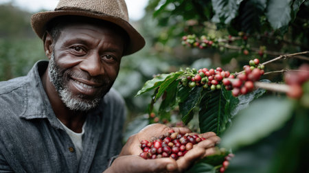 A passionate farmer holds freshly harvested coffee cherries in his hands against a background of vibrant coffee plants, showcasing dedication to sustainable agriculture.