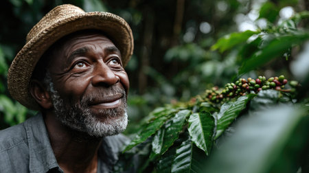 A joyful man with a grey beard wears a straw hat while admiring lush coffee plants in a vibrant green rainforest environment. The image captures the essence of sustainable farming and connection with nature.