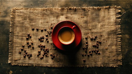 An inviting red cup of coffee sits atop a rustic burlap cloth, surrounded by scattered coffee beans. This warm still life captures the essence of a cozy coffee moment.