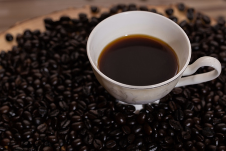 Cup of brewed espresso coffee on heap of dark coffee beans on wooden table