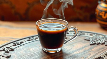Rustic ceramic cup overflowing with coffee beans on antique tray with fresh mint leaves. That the image is generated using AI.
