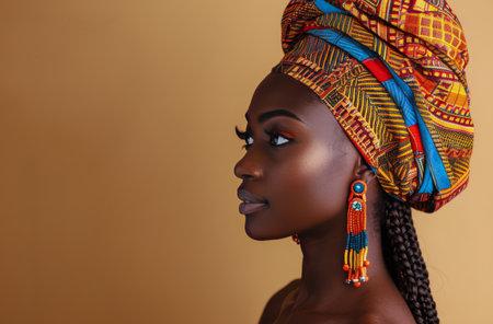 A portrait of a beautiful African woman wearing a colorful head wrap and earrings. She is looking off to the side with a serious expression.