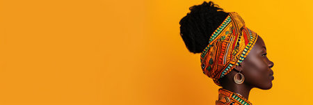 Portrait of a beautiful african woman with afro hairstyle in traditional clothes on a yellow background.