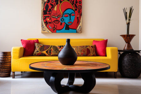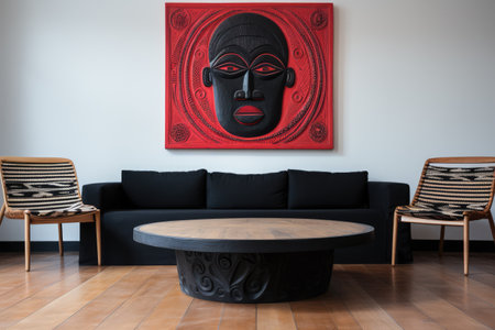 Explore a stylish living room featuring cozy decor with earthy tones and natural textures, showcasing unique cultural elements and a warm atmosphere for modern interiors.