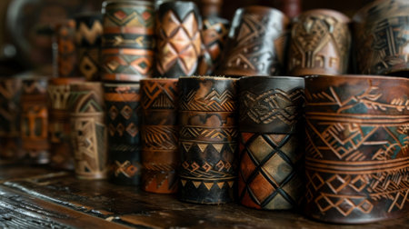 Engraved tribal patterns in warm earth tones on a rustic wooden surface
