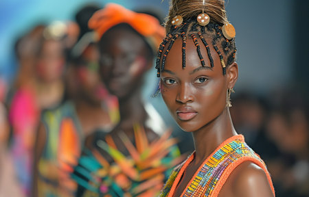 Young african female model posing with trendy fashion outfit and colorful vibrant orange optical art abstract background. Picturesque generative AI