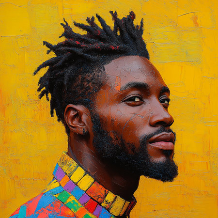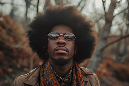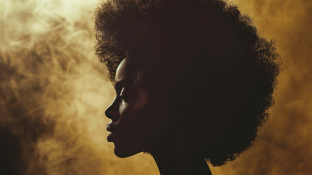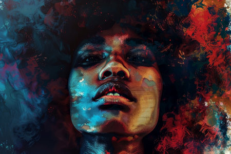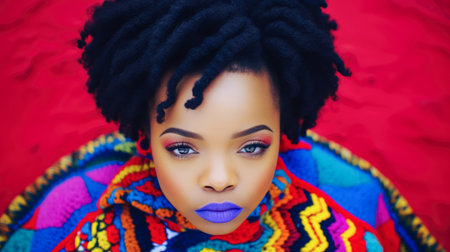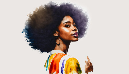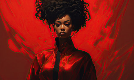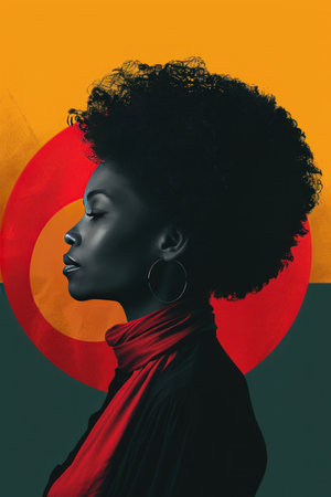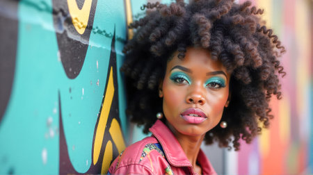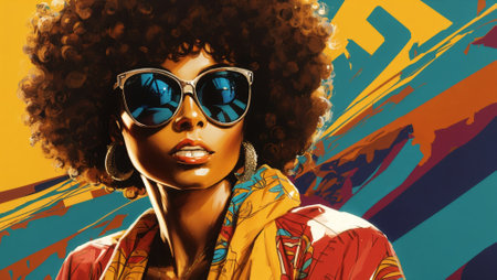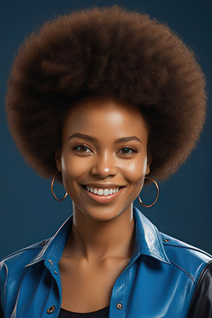 Close-up of a trendy African American woman with a voluminous afro, posing against a vibrant backdrop.