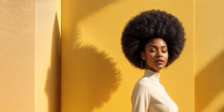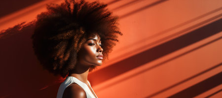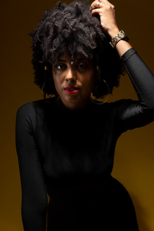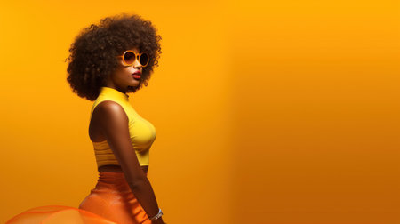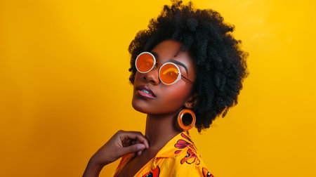 Stylish African American woman with curly hairdoposes on a vibrant backdrop.