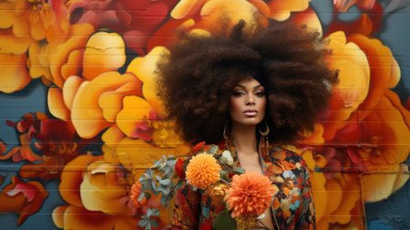 Young attractive afro woman with beautiful flowers in hair and lips. Beauty studio portrait.
