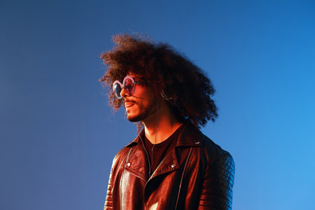 Portrait of a stylish man with curly hair with glasses and headphones on a blue background multinational, colored light, black leather jacket trend, modern concept.