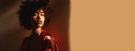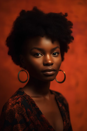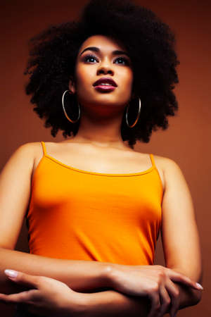 Stock photo of beautiful afro women posing in studio shot against brown background.