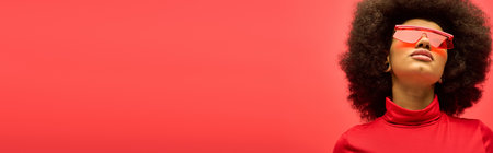 A stylish African American woman poses in a trendy red shirt and sunglasses against a vibrant backdrop.