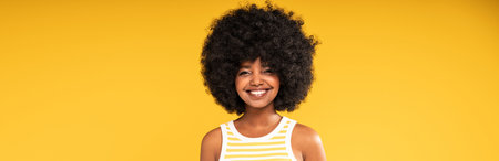 Studio portrait of happy young woman with afro hairstyle looking and smiling to the camera. Joyful girl posing on yellow vibrant background. A lot of copy space.