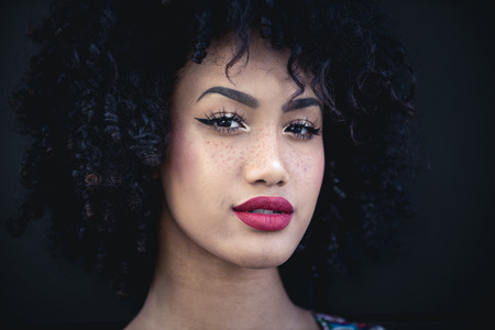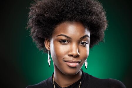 Close up full face portrait of serious african american woman with afro hairstyle on black studio background.