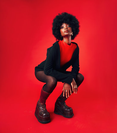 Black woman, makeup and afro, hair and fashion in portrait with shine isolated on red background. Hairstyle, haircare and texture with growth, stylish clothes and confident African model in a studio