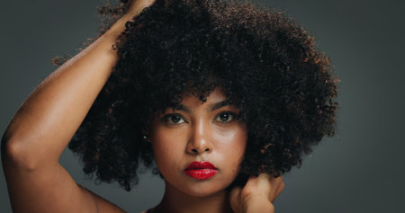 Portrait, face and woman in studio with afro, makeup and organic cosmetic for healthy curls. Proud, confident and African female person with beauty, natural hair care and lipstick on gray background