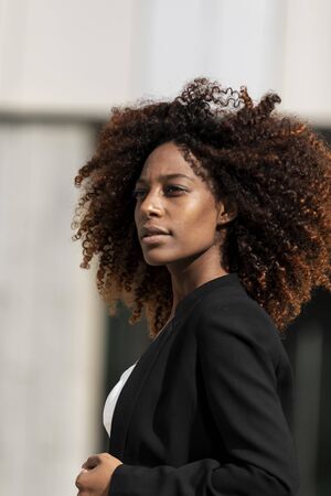 Portrait of a beautiful afro american woman standing in the street in a sunny day