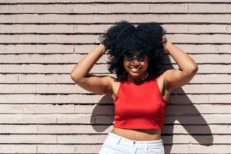 Beautiful young woman with afro hair smiling and looking at camera against wall.