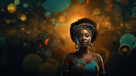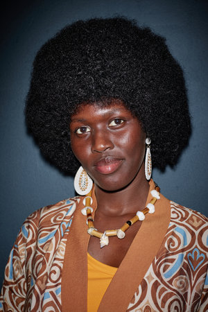 Portrait of young adult Black woman looking into camera wearing patterned clothing and jewelry celebrating Kwanzaa against plain dark background